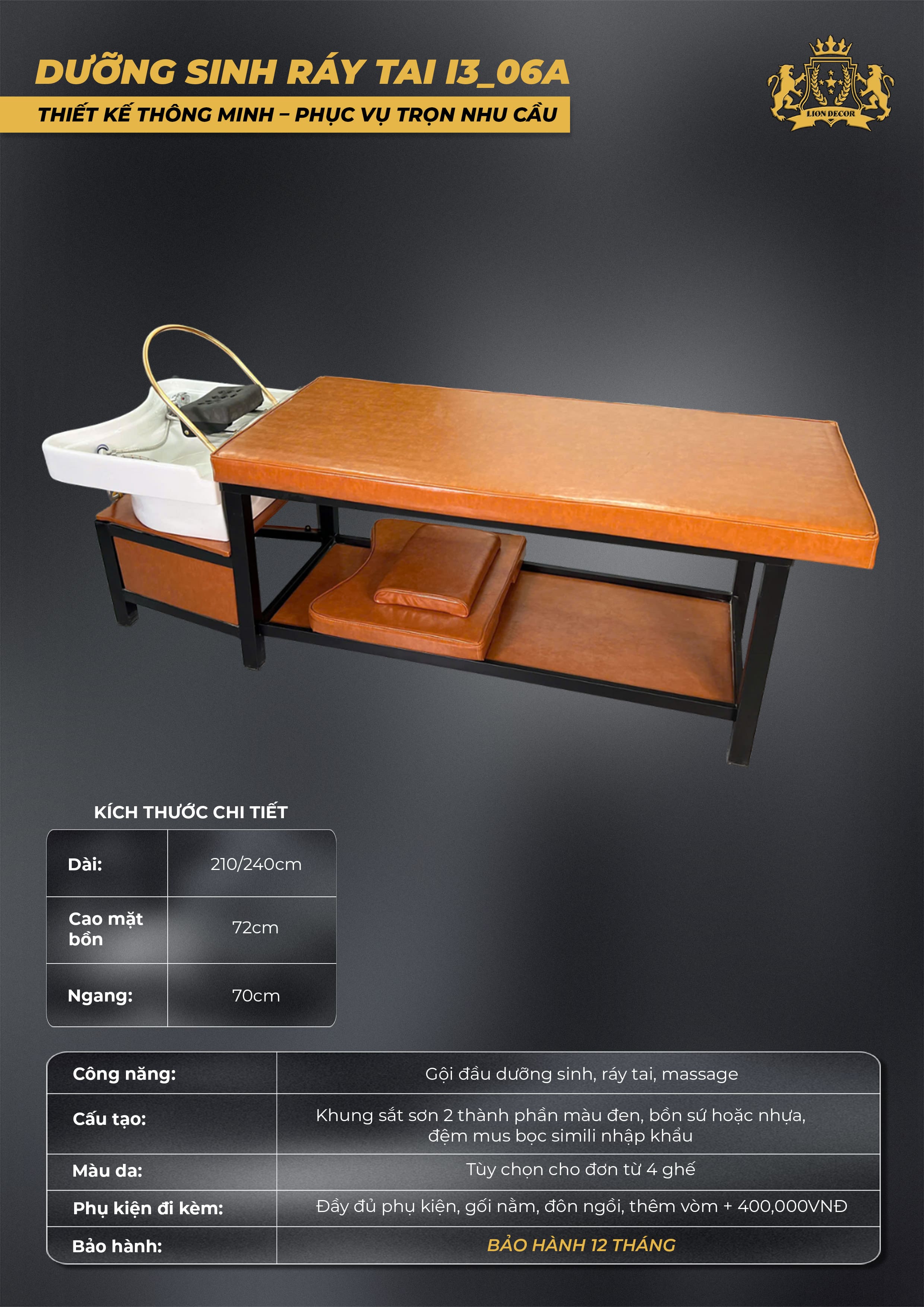 Trải nghiệm sự thư giãn toàn diện với Dưỡng Sinh Ráy Tai I3_06A, giải pháp tối ưu cho các spa, salon hoặc phòng chăm sóc sức khỏe. Sản phẩm tích hợp gội đầu dưỡng sinh, massage và chăm sóc tai, mang lại cảm giác thoải mái, nhẹ nhàng cho khách hàng từ đầu đến chân.