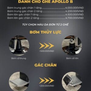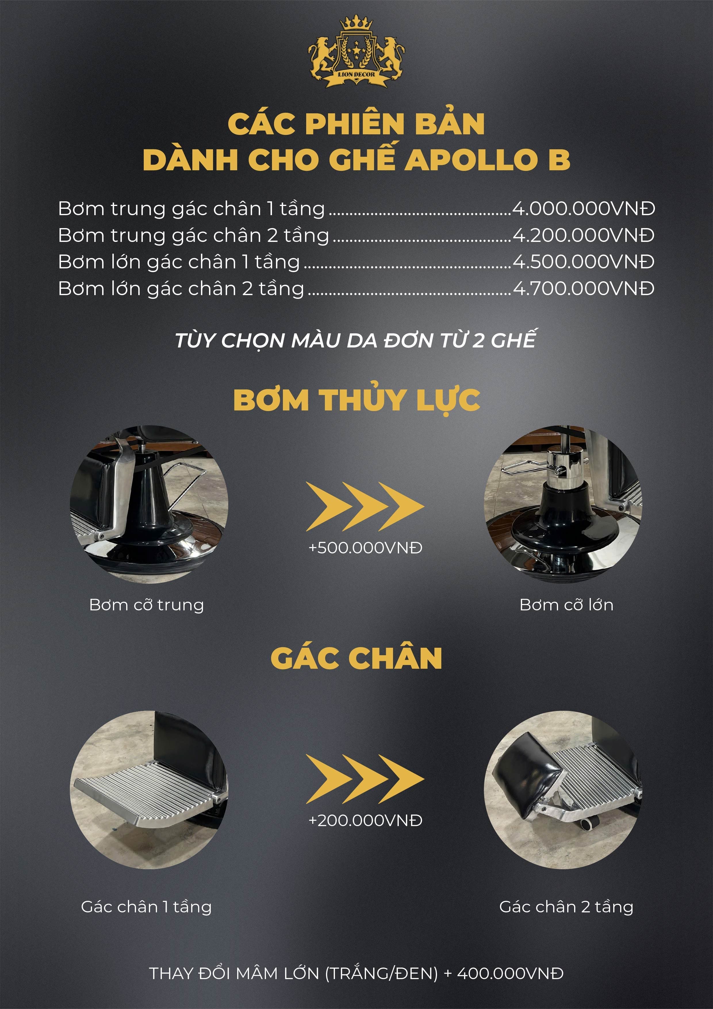 Ghế barber Apollo B còn nổi bật với chính sách bảo hành 12 tháng cho kết cấu và 24 tháng cho thủy lực, giúp chủ tiệm yên tâm tuyệt đối trong quá trình sử dụng. Đặc biệt, Lion Decor hỗ trợ tùy chọn màu da cho đơn hàng từ 2 ghế trở lên và ưu đãi giảm 5% cho đơn từ 8 ghế, tạo điều kiện dễ dàng cho việc đồng bộ không gian barber shop.