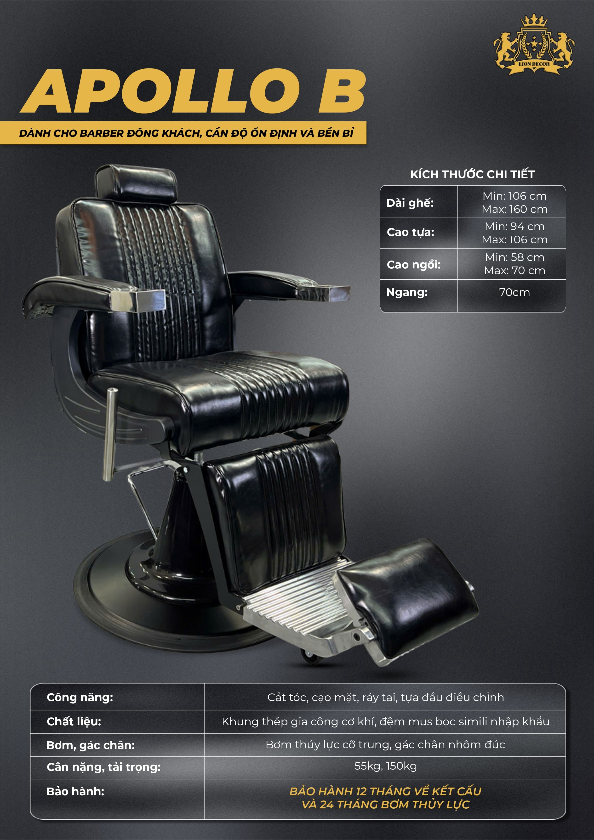 Với tải trọng lên đến 150kg cùng trọng lượng nặng, ghế giữ được sự ổn định tối đa trong khi thao tác. Apollo B không chỉ là một sản phẩm hỗ trợ công việc hiệu quả mà còn là điểm nhấn nâng tầm hình ảnh và phong cách cho tiệm tóc chuyên nghiệp.