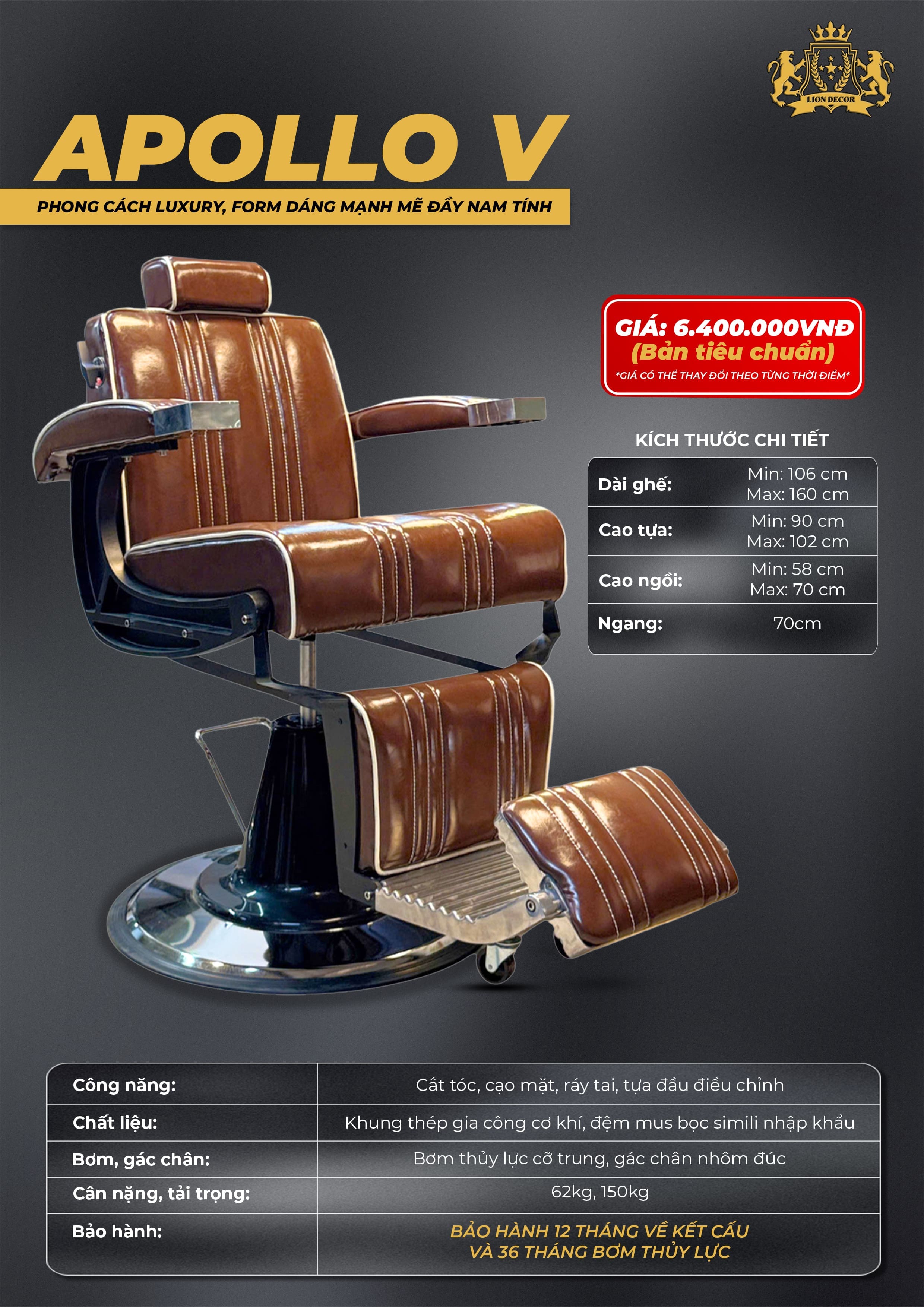 Về chính sách bảo hành, Apollo V mang lại sự an tâm vượt trội với 12 tháng cho kết cấu và lên tới 36 tháng cho bơm thủy lực. Đây là lựa chọn xứng đáng để đầu tư cho một barber shop chuyên nghiệp, khẳng định phong cách và sự đẳng cấp trong không gian tiệm tóc.