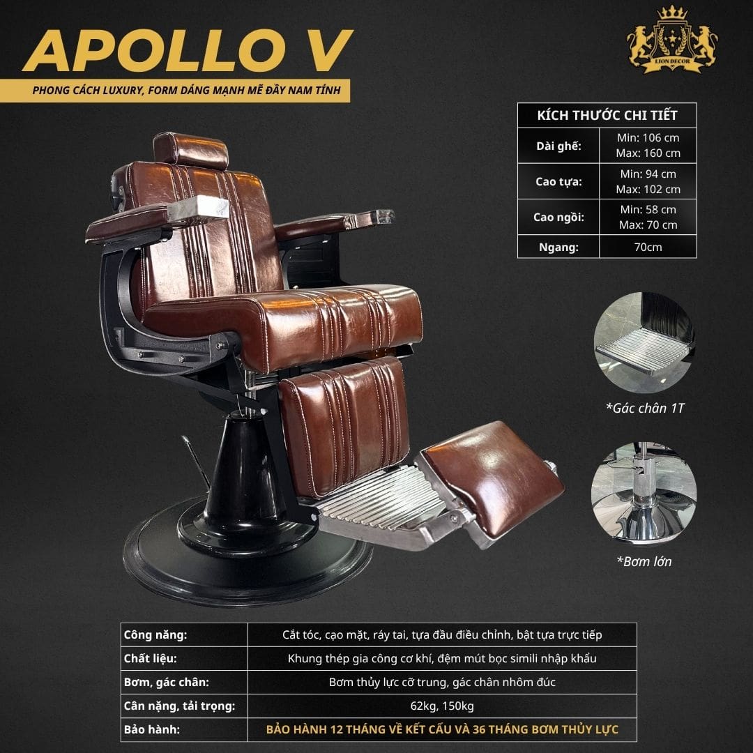 Về chính sách bảo hành, Apollo V mang lại sự an tâm vượt trội với 12 tháng cho kết cấu và lên tới 36 tháng cho bơm thủy lực. Đây là lựa chọn xứng đáng để đầu tư cho một barber shop chuyên nghiệp, khẳng định phong cách và sự đẳng cấp trong không gian tiệm tóc.