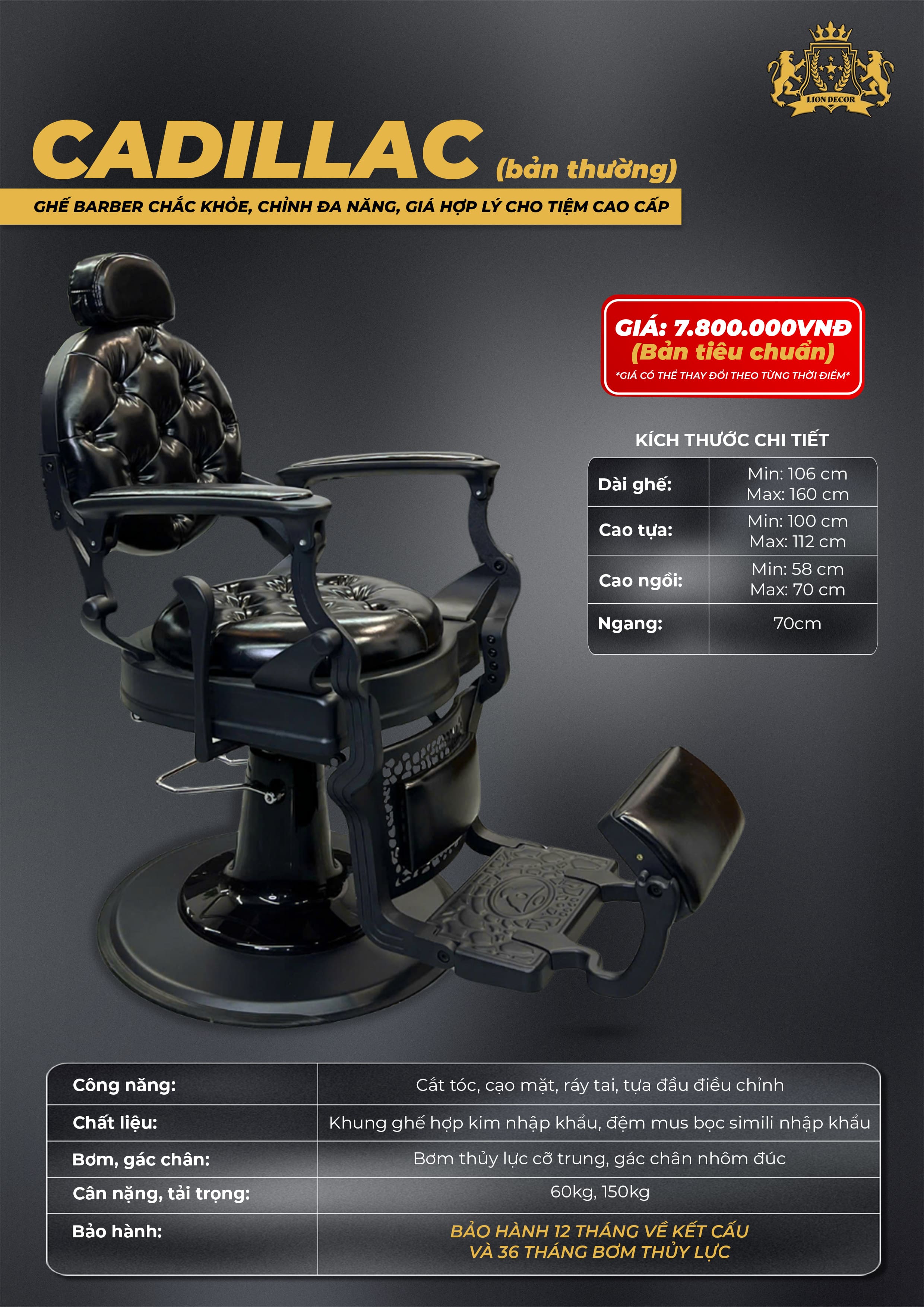 Ghế barber Cadillac bản thường sử dụng khung nhập khẩu, tuy nhiên hiện nay trên thị trường có nhiều loại khung tương tự khiến việc phân biệt trở nên khó khăn. Phần nệm mus được sản xuất tại Việt Nam, đảm bảo sự êm ái và thoải mái cho khách hàng khi sử dụng.
