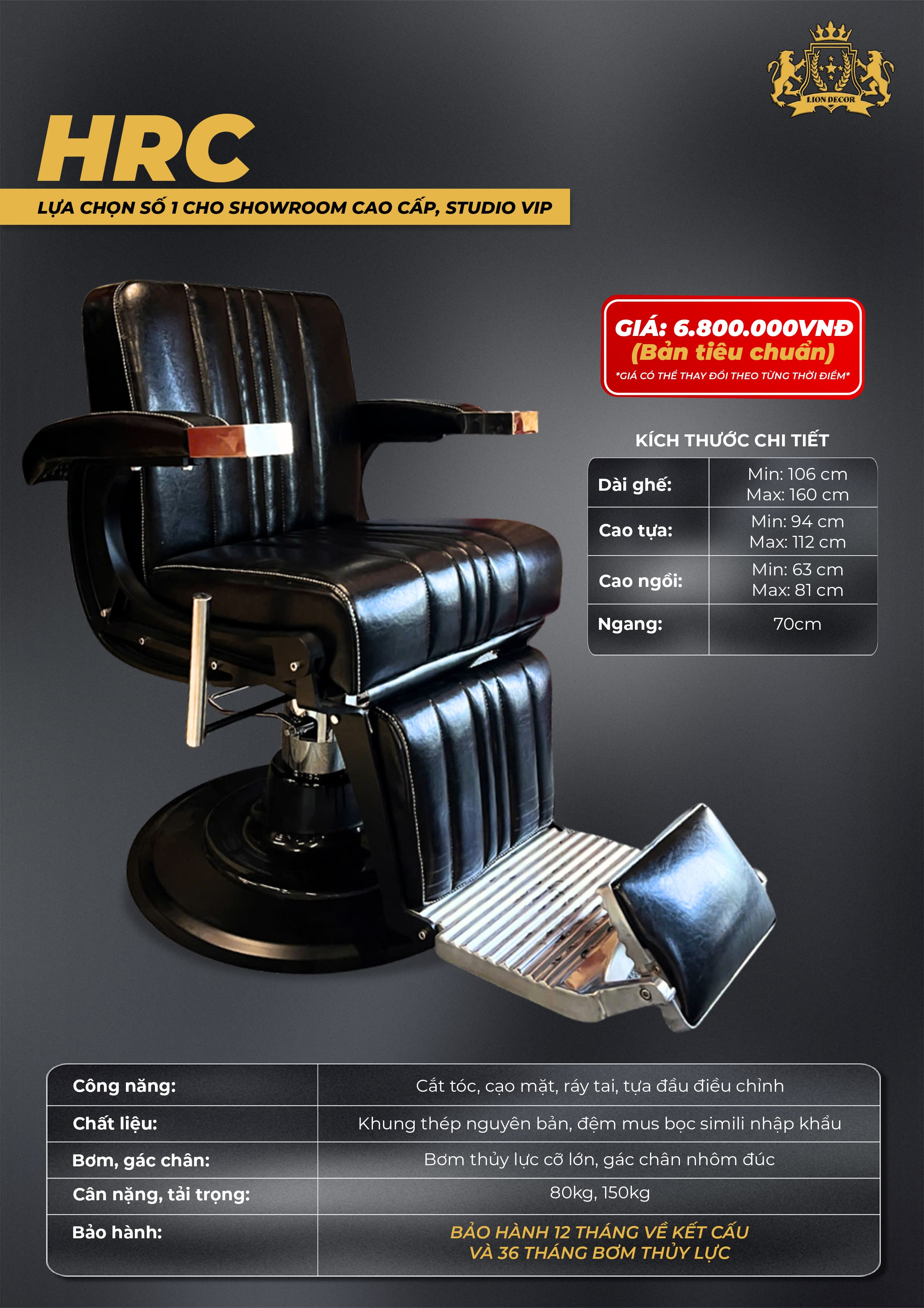 HRC có thể chịu tải trọng tối đa 150kg, phù hợp với nhiều đối tượng khách hàng khác nhau. Ngoài ra, sản phẩm còn được trang bị hệ thống thủy lực bền bỉ, vận hành êm ái, giúp nâng – hạ ghế mượt mà, mang đến trải nghiệm chuyên nghiệp cho cả barber lẫn khách hàng.