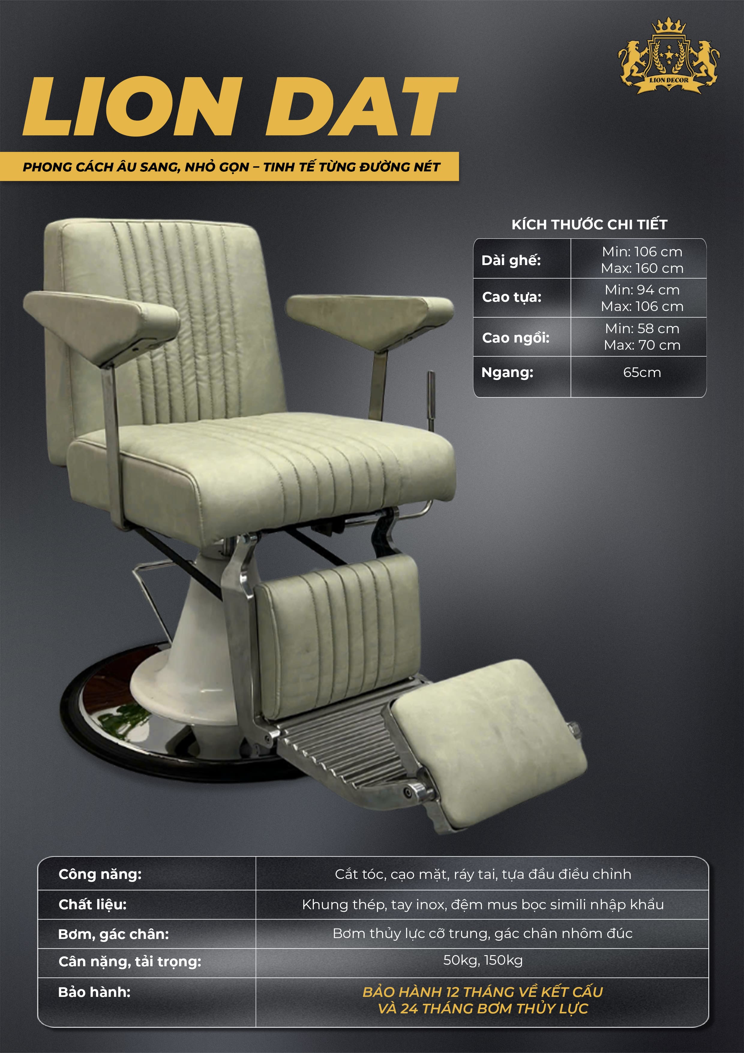 Nhờ sự kết hợp giữa thiết kế gọn gàng, khung thép chắc chắn và tay ghế inox cao cấp, ghế barber LION-DAT không chỉ đáp ứng nhu cầu công năng mà còn góp phần tạo nên không gian chuyên nghiệp, hiện đại cho salon tóc của bạn.