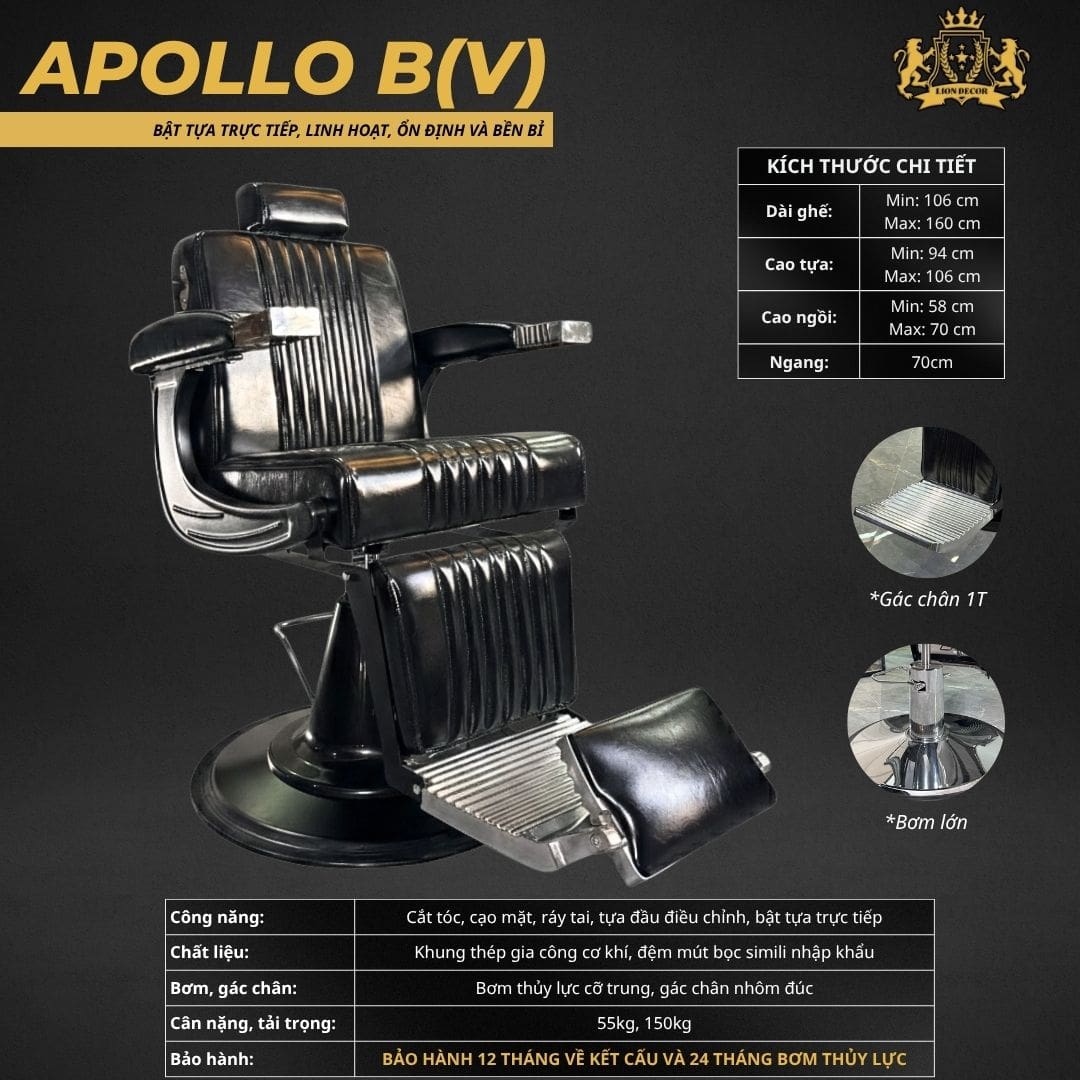 Ghế cắt tóc nam APOLLO B (V) bản VIP là lựa chọn lý tưởng cho những salon cần một mẫu ghế đẹp, bền và linh hoạt trong vận hành.