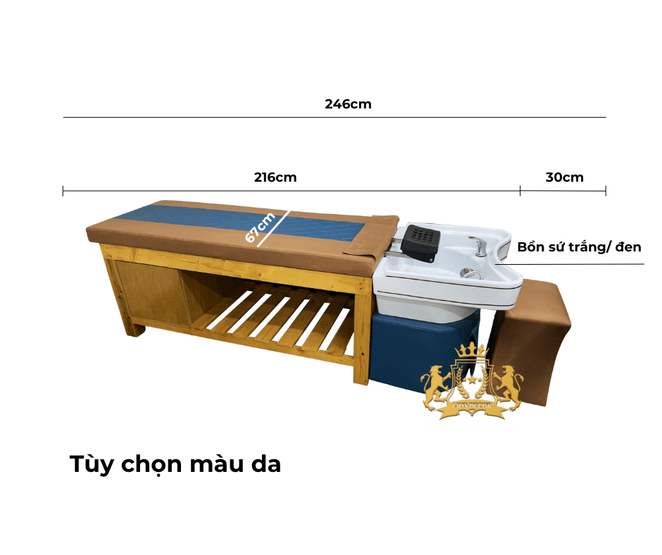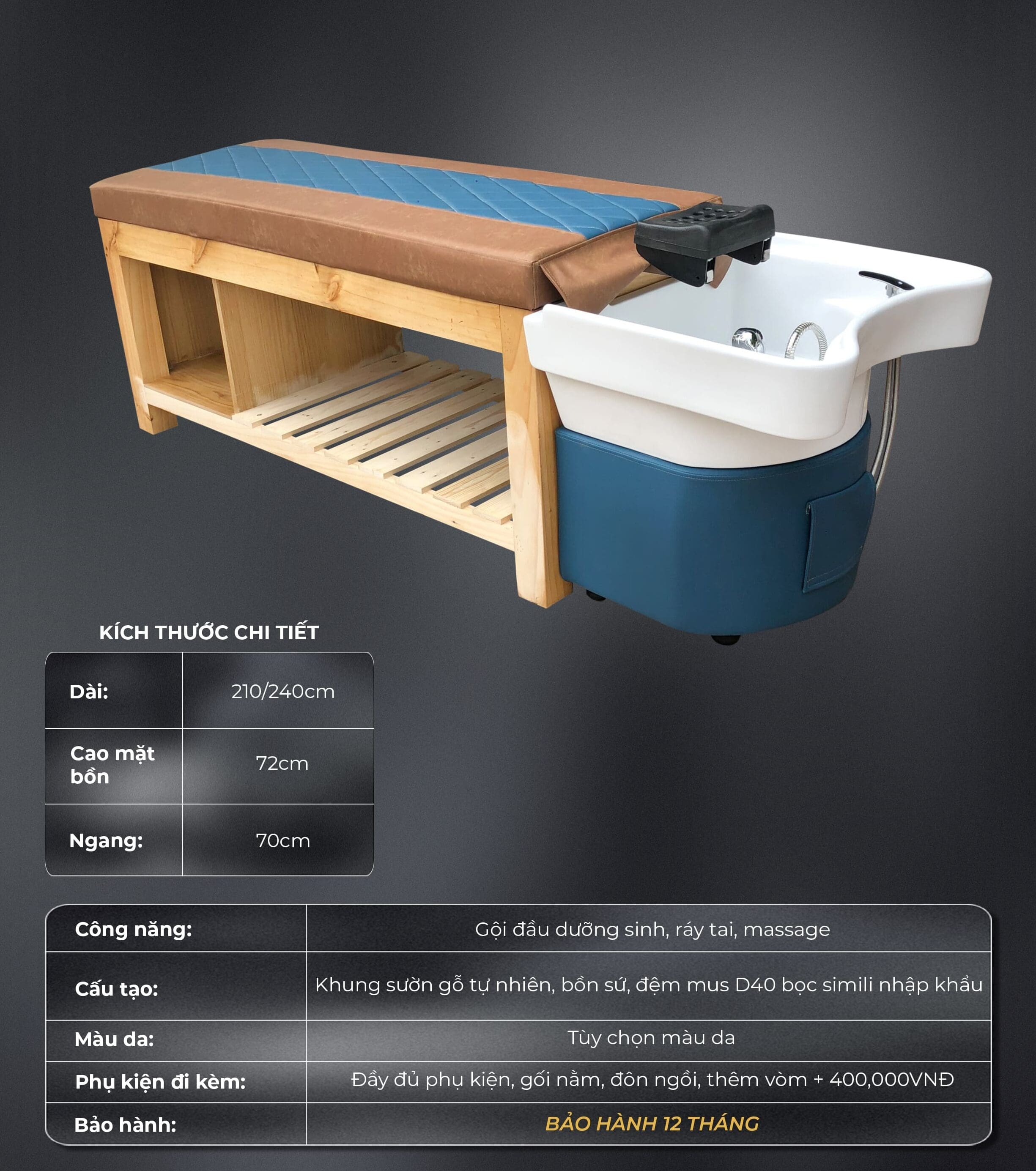 LI3_07 là mẫu giường gội dưỡng sinh kết hợp rửa tai – massage được thiết kế chuyên biệt cho spa, salon và tiệm dưỡng sinh chuyên nghiệp. Sự kết hợp giữa khung gỗ tự nhiên chắc chắn và bồn sứ cao cấp mang lại trải nghiệm thư giãn trọn vẹn cho khách hàng, đồng thời tối ưu thao tác cho kỹ thuật viên.