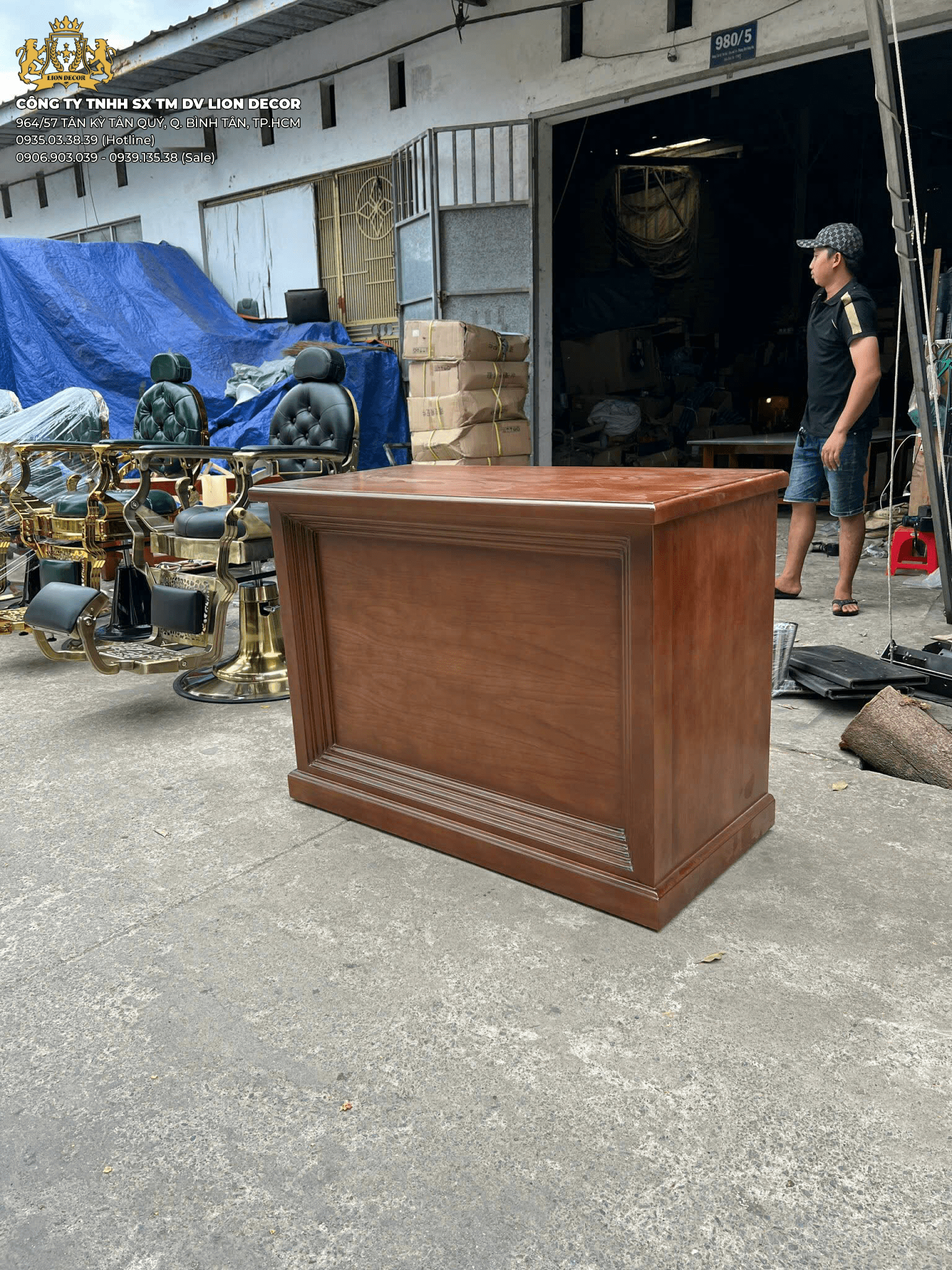 Quầy thu ngân gỗ là lựa chọn dành cho các tiệm muốn theo đuổi phong cách ấm áp, tự nhiên hoặc mang hơi hướng vintage. Gỗ tạo cảm giác thân thiện và dễ hòa hợp với các chất liệu nội thất khác trong barber, salon, spa.