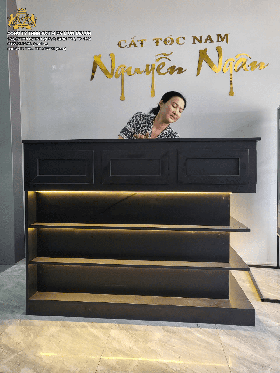 Mẫu quầy thu ngân được Lion Decor hoàn thiện theo phong cách hiện đại, sử dụng tông đen sang trọng kết hợp hệ thống LED âm chạy dọc, tạo hiệu ứng ánh sáng tinh tế và thu hút. Đây là lựa chọn hoàn hảo cho các barber shop, salon tóc và cửa hàng dịch vụ muốn nâng tầm không gian đón tiếp.