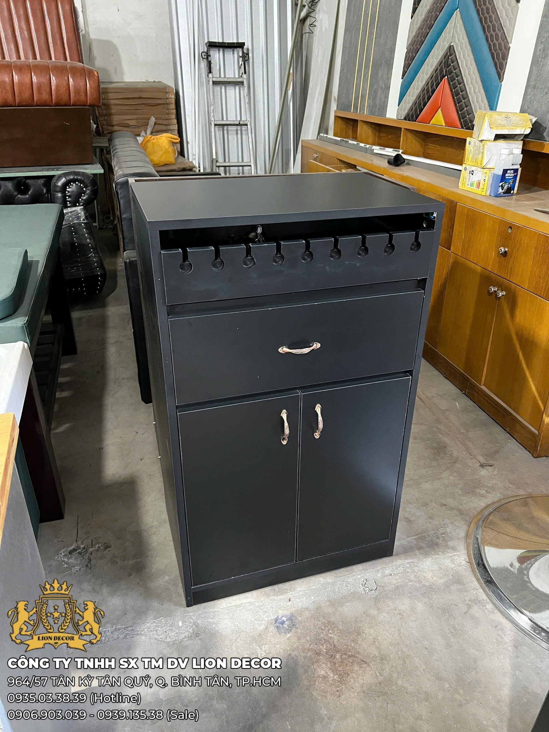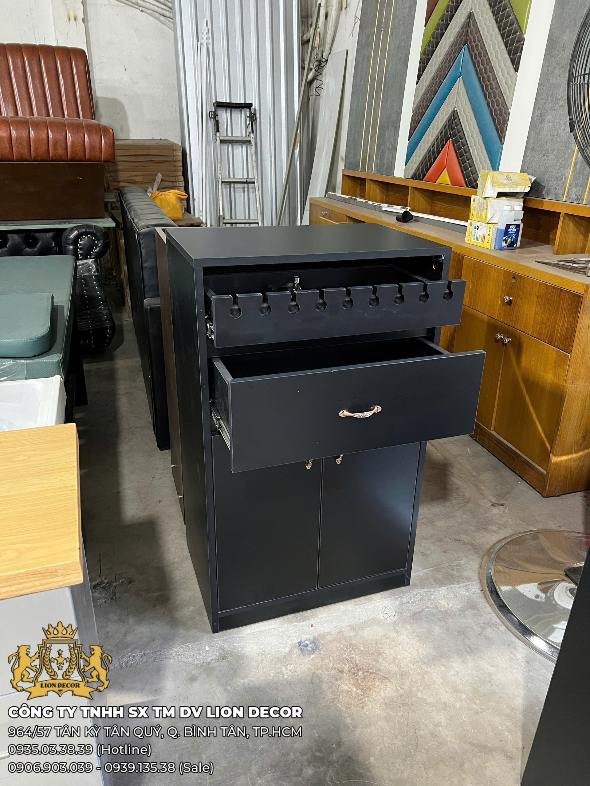 Mẫu tủ cạnh gương này được thiết kế riêng cho barber shop, với khay treo dụng cụ tiện lợi giúp thợ lấy – cất tông đơ và kéo nhanh chóng trong quá trình làm việc. Phần tủ dưới và ngăn kéo mở rộng giúp lưu trữ đồ nghề ngăn nắp, đảm bảo khu vực thao tác luôn sạch sẽ và chuyên nghiệp.