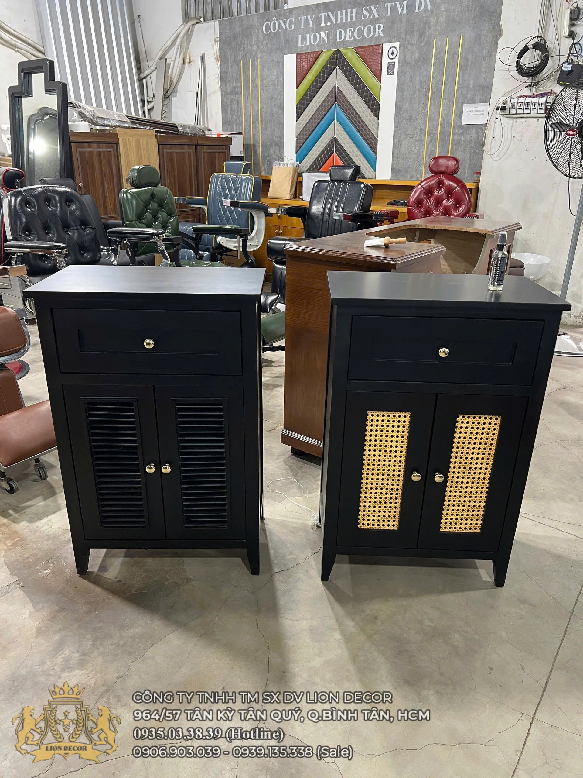 Mẫu tủ cạnh gương barber được thiết kế theo xu hướng premium craft, kết hợp gỗ sơn đen với họa tiết đan mây vàng nổi bật, mang lại vẻ sang trọng và khác biệt cho góc làm việc. Đây là lựa chọn lý tưởng cho các barber shop muốn tạo dấu ấn thẩm mỹ riêng.