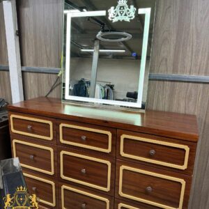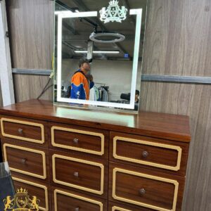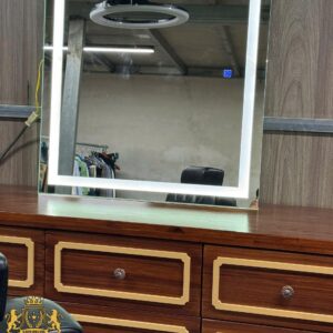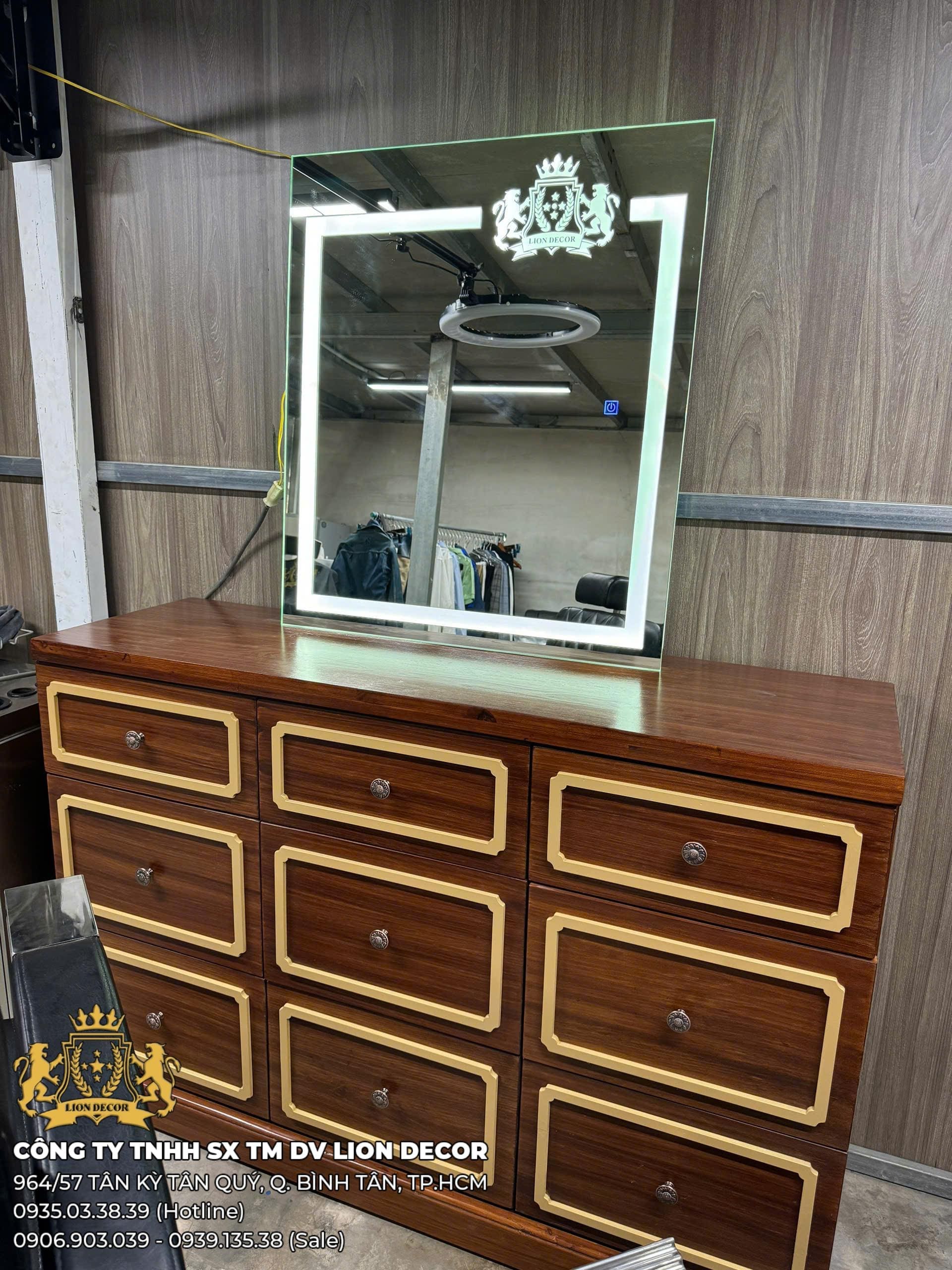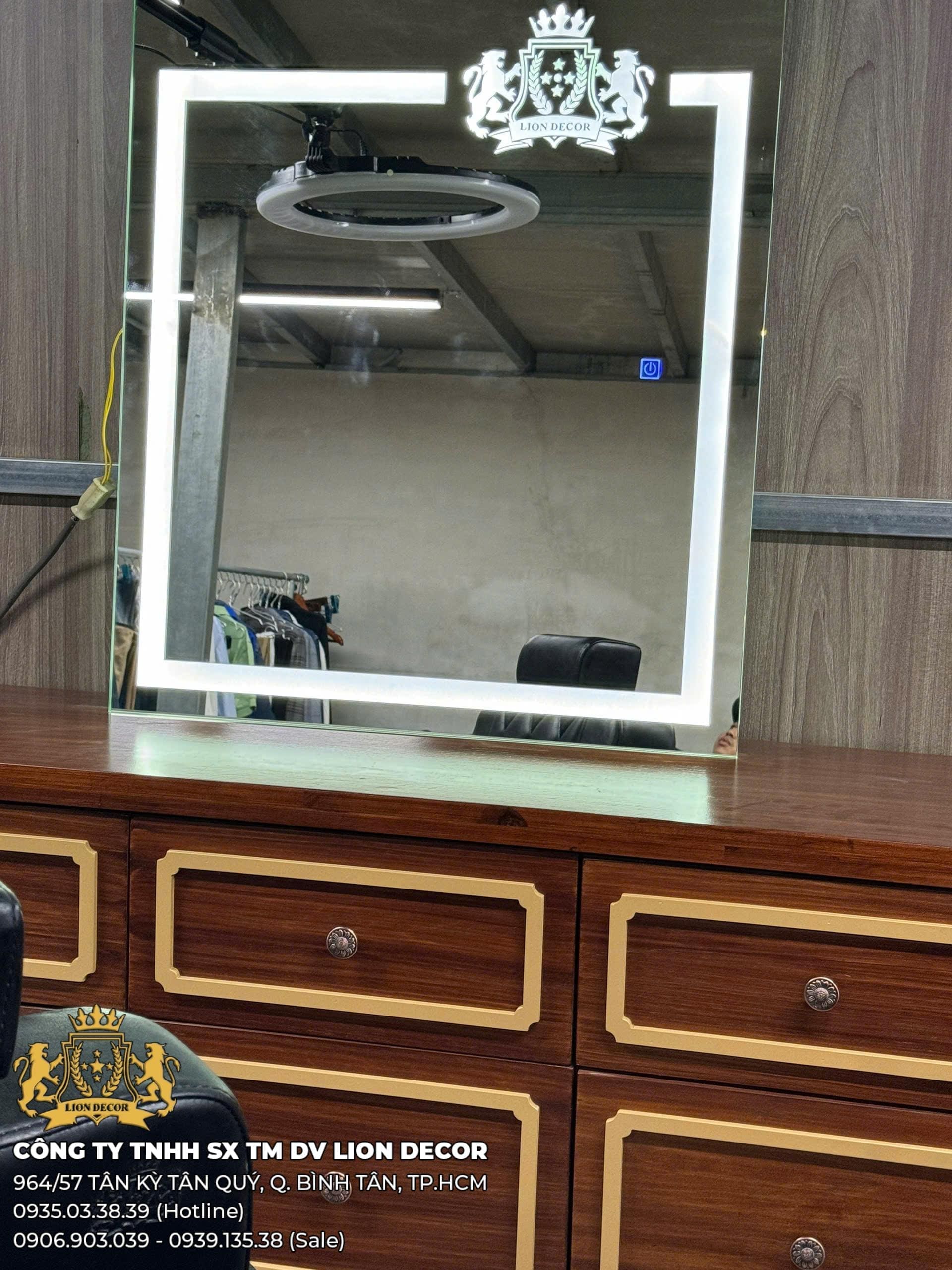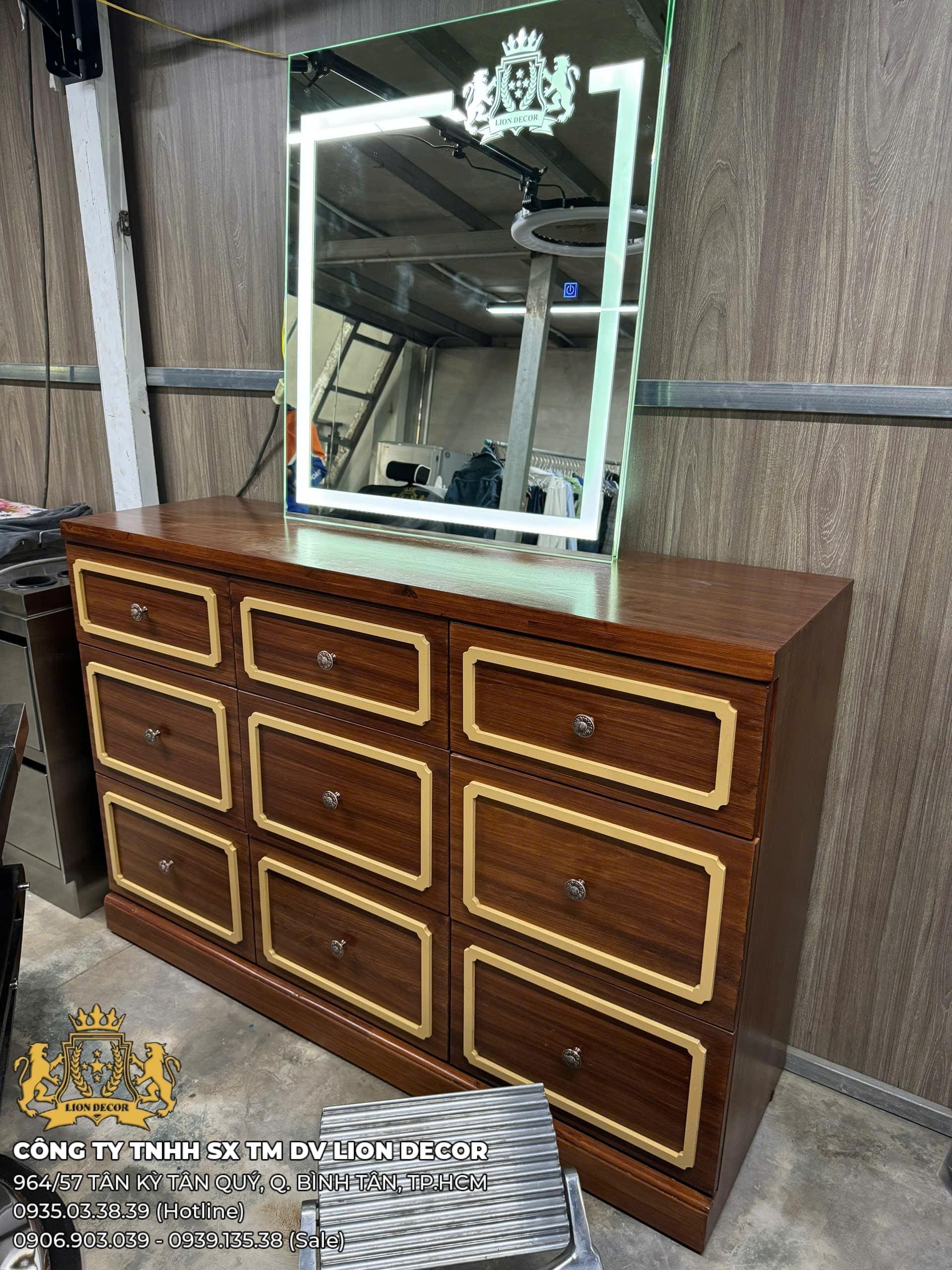Mẫu tủ gương barber kết hợp giữa hệ tủ nhiều ngăn kéo và gương LED, mang lại sự tiện dụng cao trong quá trình làm tóc. Thiết kế tông nâu cổ điển, phào chỉ nổi và form vuông vức tạo cảm giác cao cấp, phù hợp nhiều phong cách tiệm.