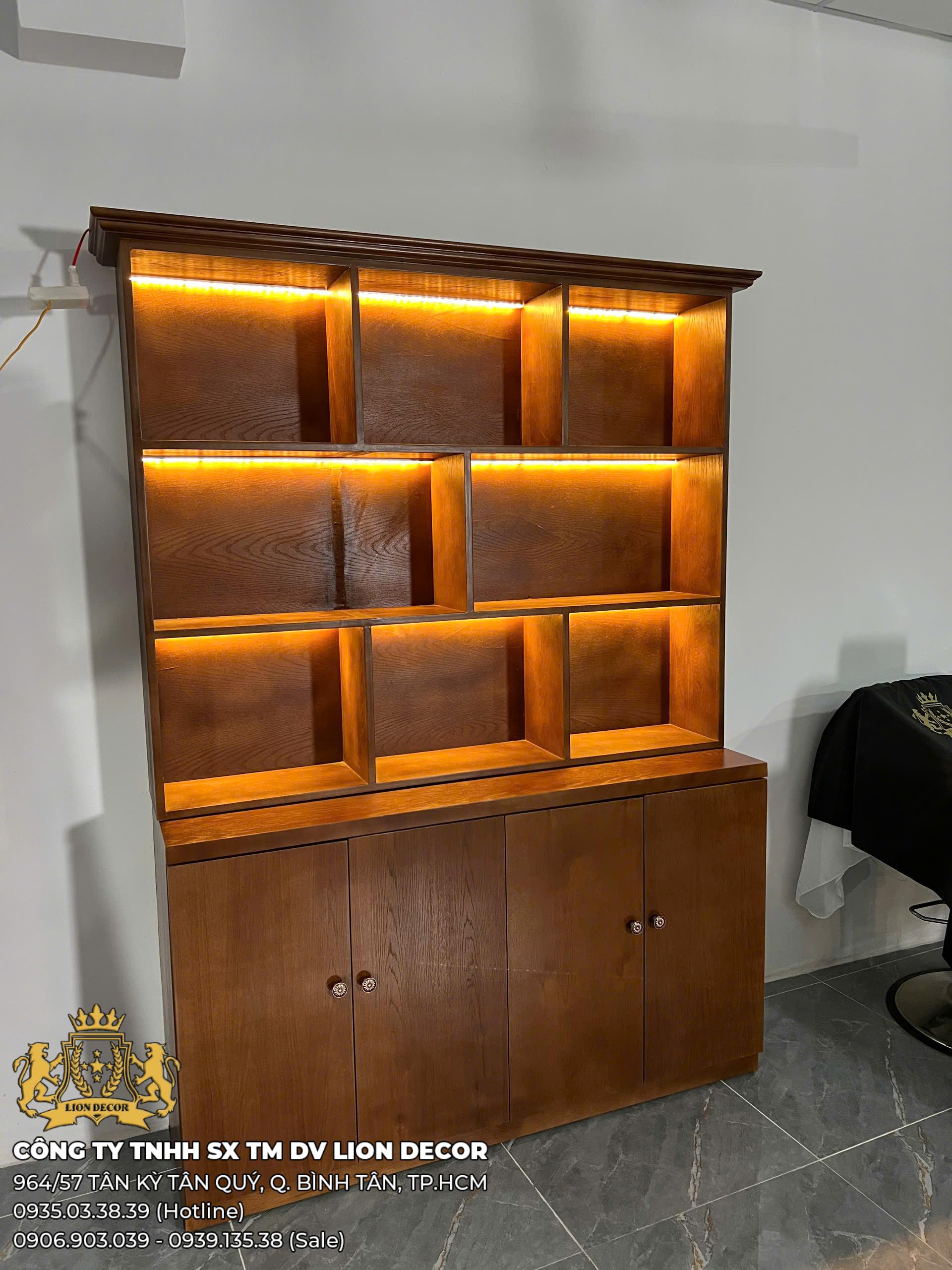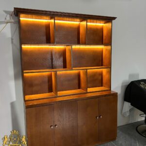 Mẫu tủ trưng bày barber thiết kế dạng mở với nhiều ô kệ vuông vức, rất phù hợp để trưng bày sáp, dầu gội, nước hoa, sản phẩm chăm sóc tóc hoặc các món decor trong tiệm barber. LED vàng ấm giúp tạo không gian chuyên nghiệp và thu hút ánh nhìn.