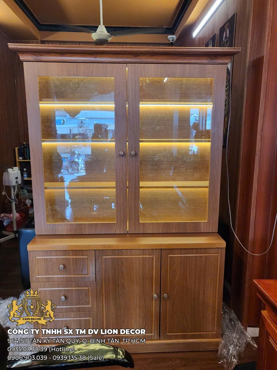 Tầng trên gồm cửa kính khung gỗ chắc chắn, dễ quan sát sản phẩm.