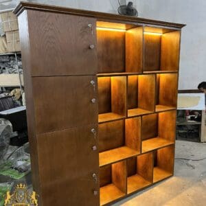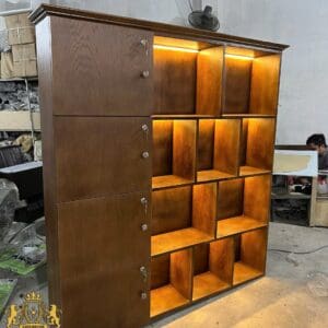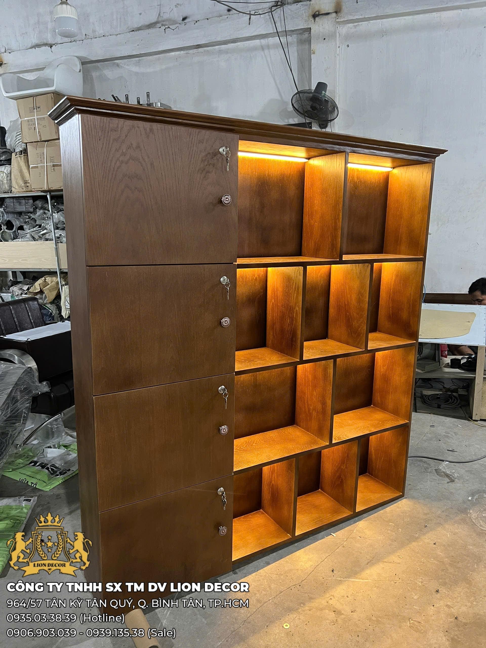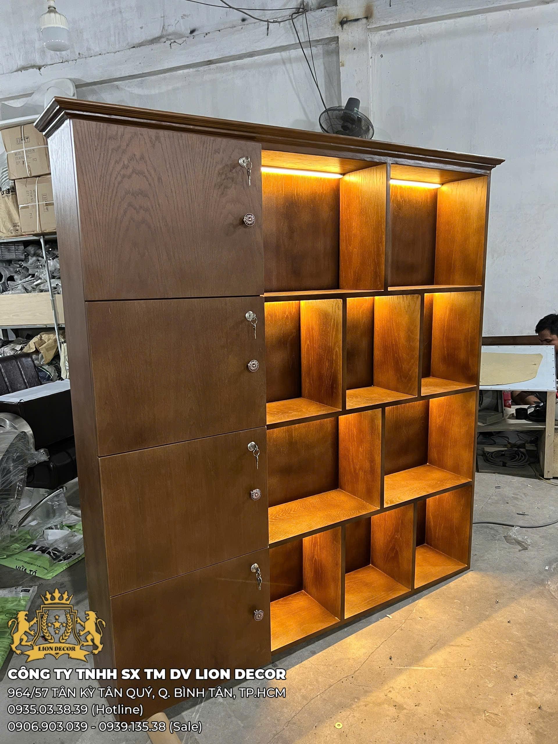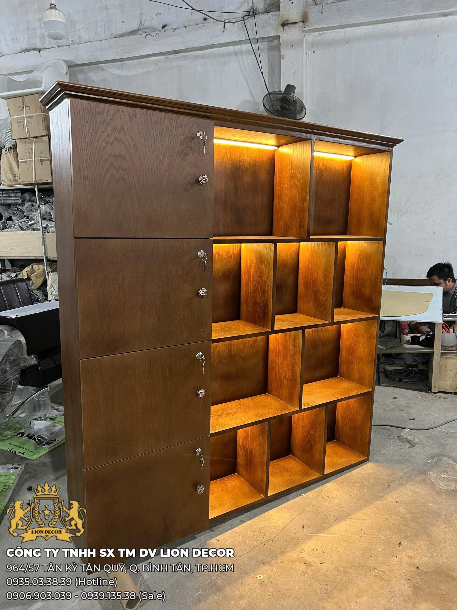 Mẫu tủ trưng bày được thiết kế theo phong cách “phá cách có tính toán”, với bố cục các ô vuông – chữ nhật xen kẽ, tạo hiệu ứng thị giác cực kỳ nổi bật. Đây là mẫu rất phù hợp với barber shop, studio, salon hoặc cửa hàng muốn tạo điểm nhấn độc lạ.